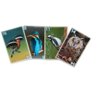 Karty edukacyjne do gry typu "Czarny Piotruś" ze zdjęciami 18 gatunków ptaków. 17 kompletów kart + 1 karta "Piotruś".