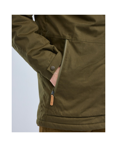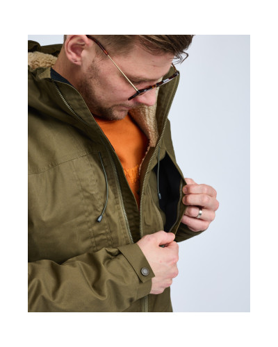 Stylowa męska kurtka zimowa o klasycznym kroju parki. Tył jest lekko przedłużony i posiada małe rozcięcie dla większej swobody ruchu. Korpus podszyty jest miękkim polarem typu „teddy”, a rękawy ocieplone materiałem Thermolite® o gramaturze 120 g. Kurtka jest wiatroszczelna dzięki woskowanej tkaninie zewnętrznej TC z dwukierunkowym streczem, która zapewnia hydrofobową powierzchnię. Wbudowane mankiety chronią przed zimnem, a końce rękawów można regulować za pomocą guzików.